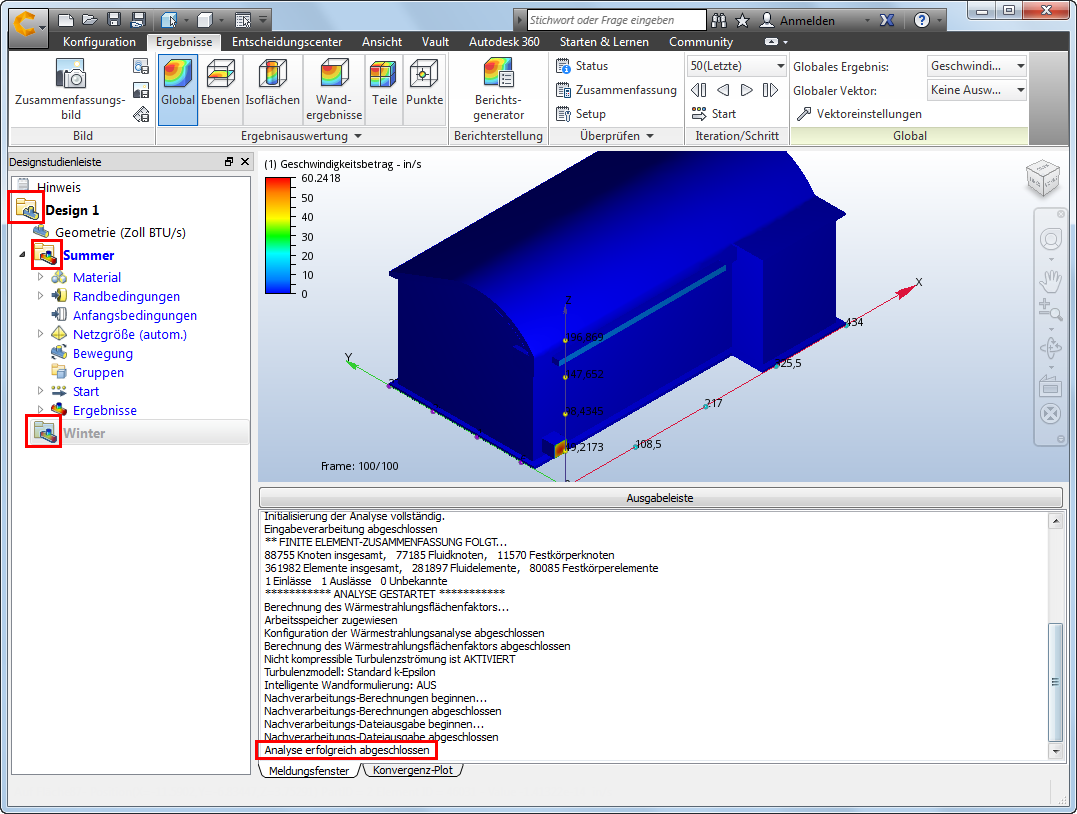 Anmerkung: Sobald beide Analysen ausgeführt wurden, verschwinden die Ausführungssymbole aus der Designstudienleiste und in der Ausgabeleiste wird „Analyse erfolgreich abgeschlossen“ angezeigt.