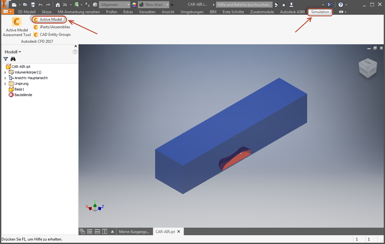 Wenn Sie z. B. das Modell aus Autodesk® Inventor starten, klicken Sie auf Simulation und Aktives Modell:
