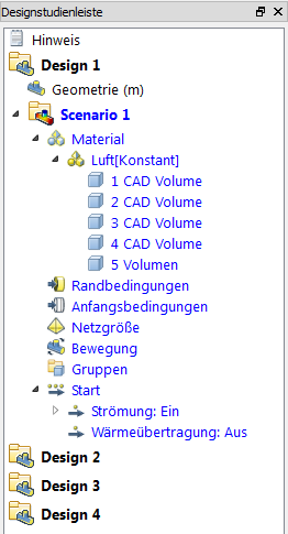 Die Designstudie wurde in Autodesk® CFD erstellt und umfasst vier Designs. Jedes Design hat ein Szenario, das durch Randbedingungen und Materialien vollständig definiert ist: