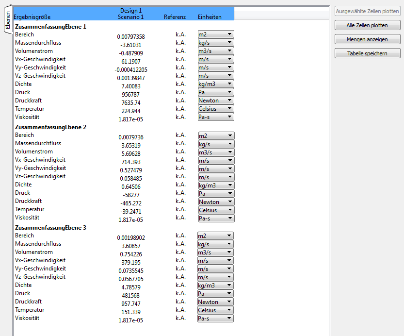 In diesem Schritt wird der Druck am Einlass, Hals und Auslass der Düse ermittelt. Hierzu werden Zusammenfassungsebenen und der Abschnitt Kritische Werte im Entscheidungscenter herangezogen.