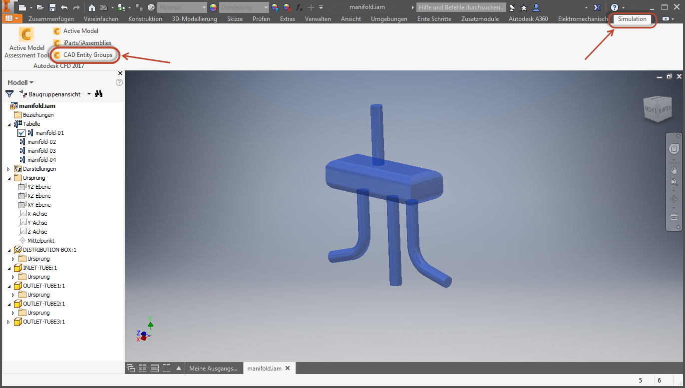 Wenn Sie z. B. aus Autodesk® Inventor starten, klicken Sie auf Simulation und CAD-Objektgruppen: