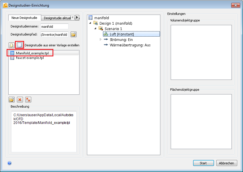 In diesem Schritt wählen Sie aus, welche CAD-Designs in der Designstudie enthalten sein sollen, und Sie öffnen die Designstudien-Einrichtung.