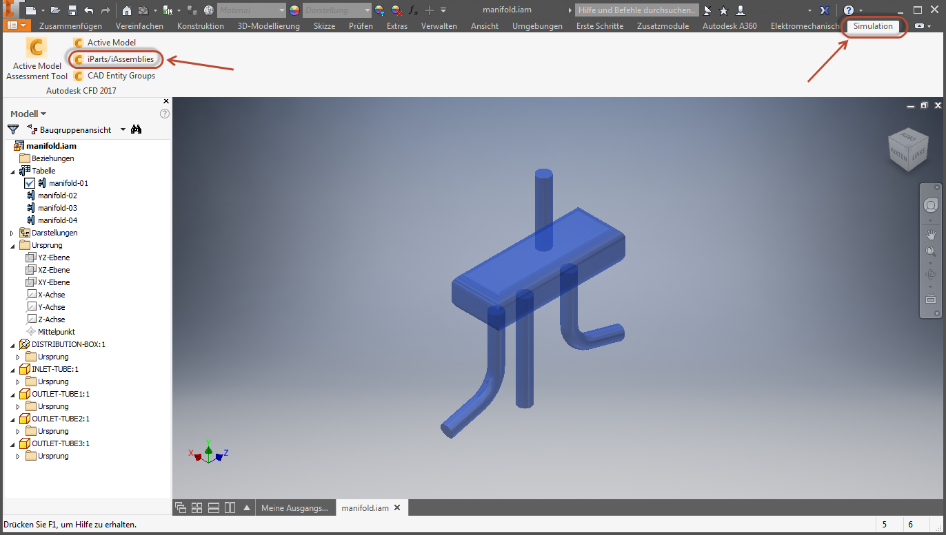 Klicken Sie in Autodesk® Inventor auf Simulation und iParts/iAssemblies: