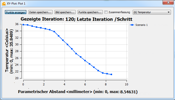 Ein hoher Temperaturgradient kann für den Anwender sehr unangenehm sein und zu Verbrennungen durch heißes Wasser führen. In diesem Schritt wird ein XY-Plot der Temperatur am Auslass erstellt. Diese aussagekräftige grafische Darstellung ermöglicht die Bewertung der Temperaturschwankungen am Auslass.