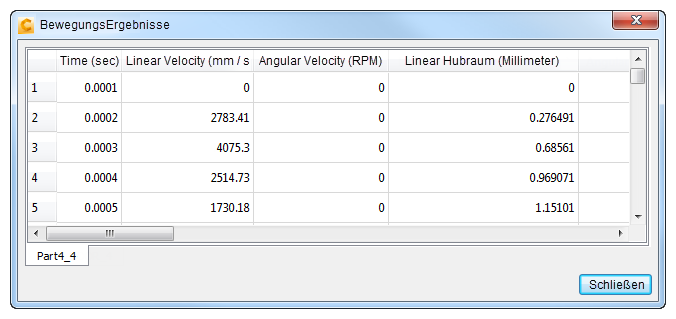 In diesem Schritt wird der zeitliche Verlauf der Verschiebung und Kraft für den Teller mithilfe der Bewegungsergebnistabelle bestimmt. Diese Tabelle enthält den vollständigen Verlauf von Geschwindigkeit, Verschiebung, Kraft und Drehmoment des beweglichen Festkörpers.