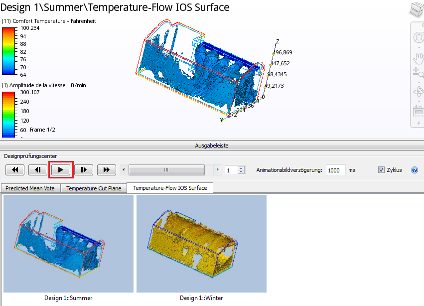 In der vorherigen Prozedur haben Sie die Temperatur in der Hallenmitte untersucht und einige wesentliche Unterschiede zwischen dem Sommer- und Winterszenario festgestellt. In diesem Schritt untersuchen Sie mithilfe des Isoflächen-Vergleichsbilds die Wechselwirkung zwischen Strömung und Temperatur.