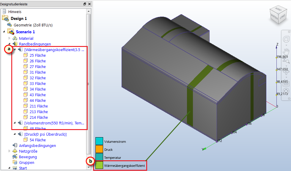 15. Um zu überprüfen, ob die Wärmeübergangskoeffizient-Randbedingung korrekt auf die Außenflächen angewendet wurde, überprüfen Sie die Designstudienleiste und den Farbstreifen auf den Flächen:
