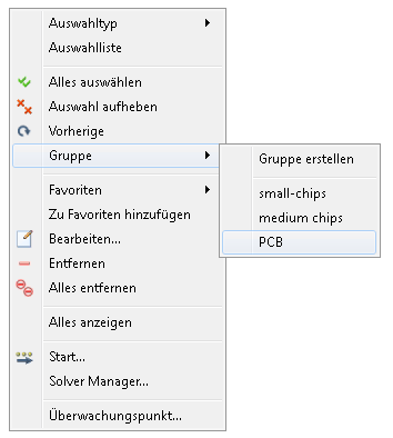 Klicken Sie mit der rechten Maustaste in das Grafikfenster, und wählen Sie Gruppe. Wählen Sie die Gruppe Leiterplatte aus.