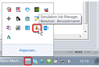 - Suchen Sie das Simulation Job Manager (SJM)-Symbol im Infobereich des Windows-Systems. Normalerweise ist es eines der ausgeblendeten Symbole. Klicken Sie oben rechts im Bildschirm auf den Nach-oben-Pfeil, um auf die ausgeblendeten Symbole zuzugreifen: