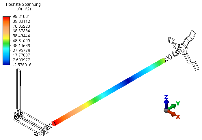 Wichtig: Die Balkenelementformulierung berechnet nur die Biegungs- und die Axialspannung. Balkenelemente liefern keine Ergebnisse für Torsionsspannung. Die Balkenelemente tragen keine Axiallast und nur einen sehr kleinen Biegemoment aufgrund der Reaktionskraft an der Teilverbindung, die mit einem kurzen Abstand vom Wellenansatz einwirkt. Aus diesem Grund ist die angegebene Spannungsgröße in den Balkenelementen so gering. Entnehmen Sie die Torsionsspannungen aus den vorangegangenen Von-Mises-Spannungsergebnissen in den kurzen Ziegelelement-Bauteilen der Hohlwelle (bzw. den Spannungstensoren der XY- oder YZ-Ebene).