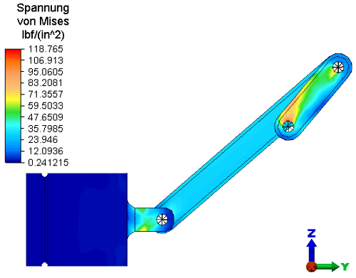 Die Analyse kann je nach vorhandenen Computerressourcen recht lange dauern. Ein Archiv mit den Ergebnissen, Piston Results.ach, steht in Ihrem Ordner mit den Lernprogrammmodellen bereit. Auf Wunsch können Sie in dieser Datei die Ergebnisse einsehen, ohne die Analyse bis zum Ende ausführen zu müssen. Die Ergebnisse für die Von-Mises-Spannung bei Zeitschritt 5 werden unten angezeigt.