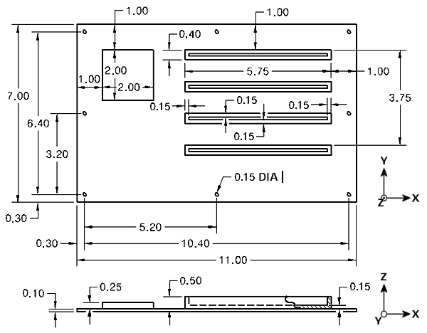 Erstellen Sie ein Volumenmodell der unten gezeigten Leiterplattenbaugruppe mit Autodesk SimStudio Tools. Alle Bemaßungen sind in Zoll: