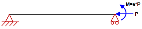 Lasten, die keine Stauchung verursachen, wirken sich nicht auf die Knickberechnung aus. Es ist unbedingt zu beachten, dass bei der Berechnung der kritischen Knicklast für Balkenelemente nur die axiale Komponente der Lasten berücksichtigt wird. Stellen Sie sich z. B. eine Versatzlast am Ende einer Stange vor (siehe Abbildung 3 (a)). Sie kann als Axiallast und -moment am Ende eines Balkenmodells dargestellt werden (Abbildung 3 (b)). Da das Moment keine axiale Spannung in den Balkenelementen erzeugt, führt die Versatzlast in dieser Analyse zu demselben Ergebnis wie eine reine Axiallast. (Das Moment erzeugt Biegespannungen; die theoretische Stauchung auf einer Seite des Balkenelements wirkt sich nicht auf die Knickberechnung aus.)