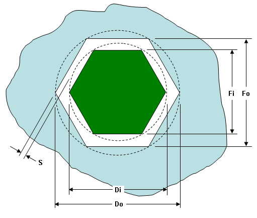 Sie können den Durchmesser D zur Abmessung der Fläche F mithilfe von grundlegender Geometrie in Beziehung setzen: