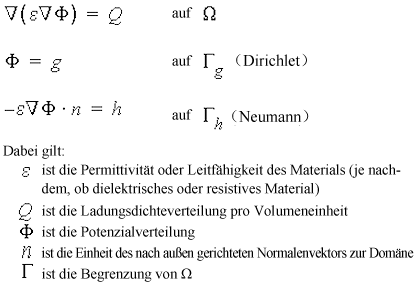 Die zugrunde liegendene Teil-Differentialgleichung (Partial Differential Equation, PDE) ist die Quergleichung. Diese PDE ist für die Analyse dielektrischen (elektrostatische Feldstärke und Spannung) sowie resistiven Materials (elektrostatischer Strom und Spannung) gültig. Die starke Form des Problems wird im folgenden Abschnitt definiert: