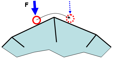 (a) Für einen Zielknoten (roter Kreis) auf einem anderen Körper (nicht angezeigt) wird Kontakt durch die Kraft F erzwungen, während er sich von links nach rechts bewegt. Während sich der Knoten von einem Element zum nächsten bewegt, ändert sich die Richtung der Reaktionskraft ohne Verzögerung, wodurch es zu Konvergenzschwierigkeiten kommen kann. |