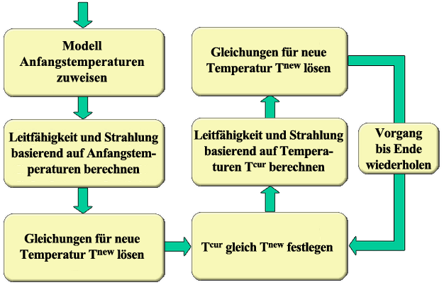 Die neu angenommenen Temperaturen werden verwendet, um den Leitfähigkeitskoeffizienten zu aktualisieren und die Strahlungsgleichungen neu zu berechnen. Der Vorgang wird wiederholt.