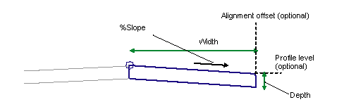The level of the edge of carriageway is calculated from the Width and % slope input parameter values. The width is then tied to the offset alignment. |