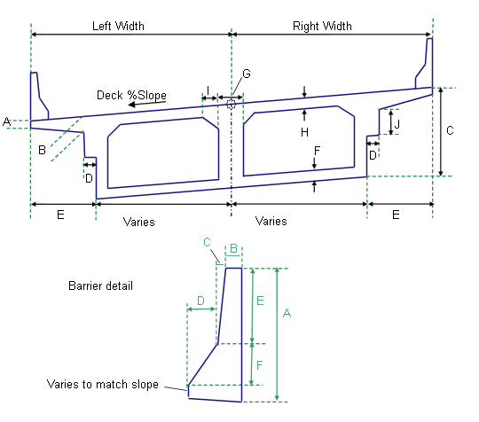 If Include Barriers is True, one-sided New Jersey barrier sections are added at the left and right edges-of-deck. The slopes of the barrier bottoms adjust to match the deck slopes.