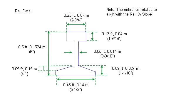 The links for the rails, sleeper, ballast, and sub-ballast are calculated and placed based on the input parameter values provided. If the Rail %Slope is non-zero, the corridor profile level is held at the center of the rail on the low side. The finish surface, sleeper, ballast, and sub-ballast links are maintained at the Rail %Slope.