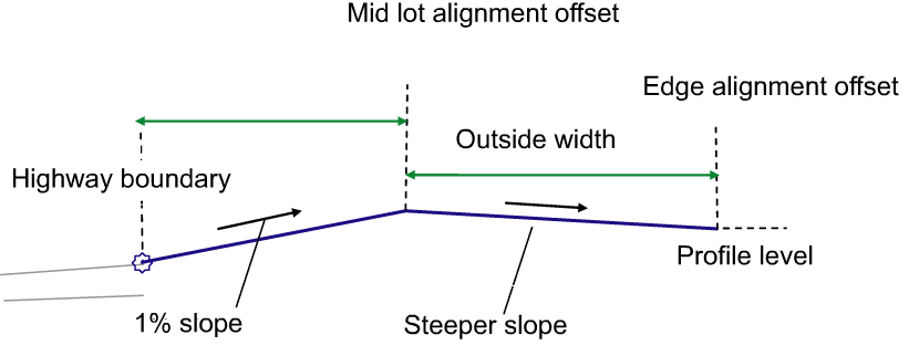 The plot gradient assembly tool needs to start at the highway boundary and, much like the BasicLaneTransition subassembly, it will hold gradient and change offset to the middle of the plot at a default slope of 1%. The value of the slope can be input by the user. At the middle of the plot will be an alignment with no profile. So the assembly will be a link from highway boundary to that mid plot alignment at 1% slope. Then the mid plot alignment will link to the back of plot, which is a fixed level; for example, 74.00 feet. We need to maintain a minimum slope of 1% on the back half of the plot as well. Therefore there needs to be a rule in place if the front of the plot gradient at 1% slope does not allow for a minimum slope of 1% for the back half of the plot, then the back half of the plot gradient needs to change to 1% and the front half plot gradient needs to go steeper.