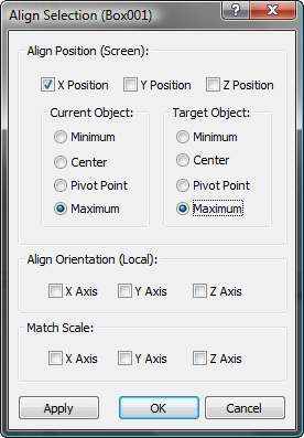 - In the Current Object group, choose Maximum and in the Target Object group choose Maximum as well. (Choosing Minimum for both Current and Target objects would align the two boxes on their left sides.) Click OK.
