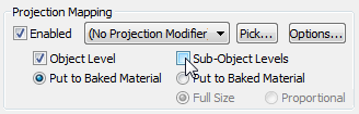 Projection Mapping group, turn on Enabled. Since the plane object you will bake the texture to consists of only a single flat surface, turn off Sub-Object Levels.