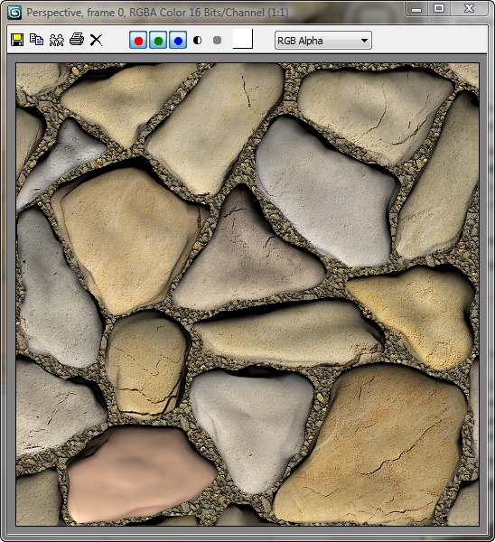 The rendering shows only the information from the diffuse map. The normal bump and height maps have also been baked into the texture of the plane, but they are not visible. In the next lesson, you will use the Material Editor to display the complete projected texture in the viewports.