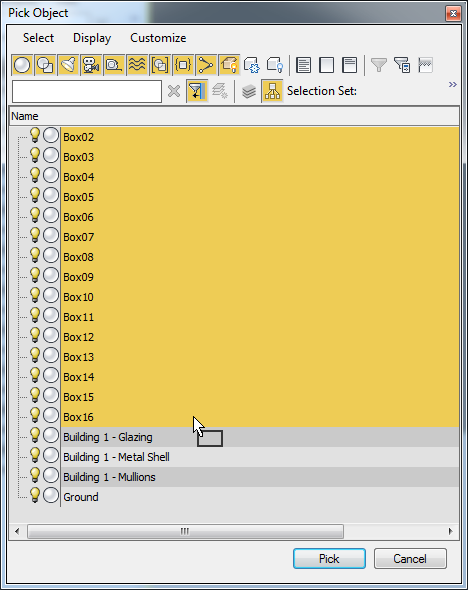 - Press H to open the Pick Object dialog. In the list, select all the Box objects, and then click Pick.