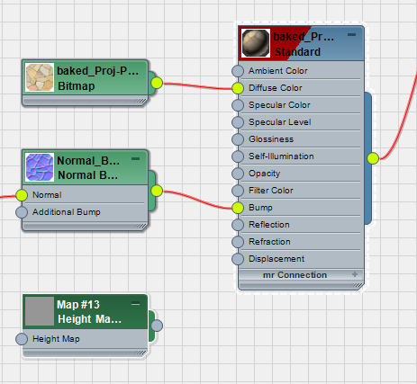 - On the baked_Proj-Plane_mtl material node, click the plus-sign icon (+) to open the “mr Connection” group, and then wire the Height Map Displacement node to the “mr Connection: Displacement” component of the baked material.