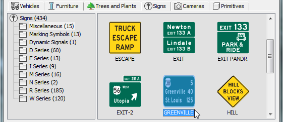 - With the Miscellaneous group highlighted in the hierarchy at the left, scroll down the list at the right and click to highlight the sign labeled GREENVILLE.