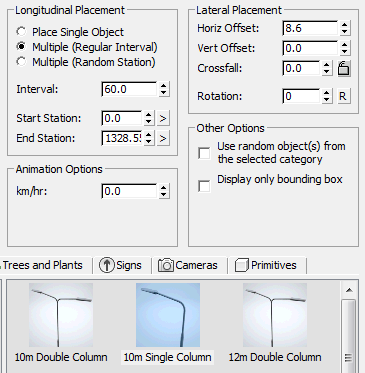 - In the Longitudinal Placement group, make sure Place Single Object is chosen, and change the value of Start Station to 50.0. In the Lateral Placement group, set Horiz[ontal] Offset to –8.0.