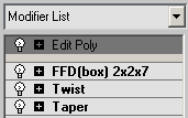 You will start by cloning the object you created in the previous lesson. You will then take the clone, which retains twist, taper, and FFD modifiers, and use polygon editing techniques to create the structure’s mullions.