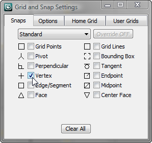 - Activate the Snaps tab, click Clear All, turn on Vertex, then