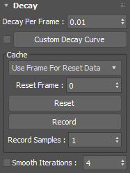 - Sets the amount of decay per frame. The higher the value, the faster the decay. A value of 0.0 indicates no decay.