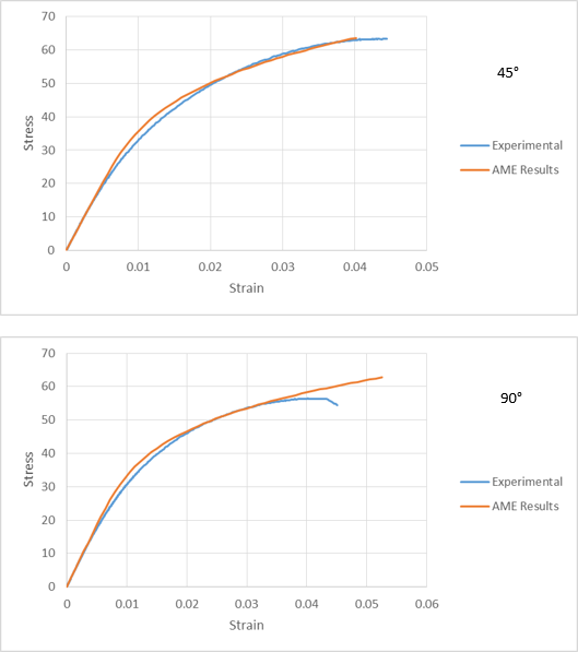 We can see a very good agreement between the experimental data at zero degrees and the outputs from Advanced Material Exchange. Keep in mind, Advanced Material Exchange uses a stress-based failure criterion, so the fact that we get a very similar ultimate stress for each curve gives us confidence that the tool can be used reliably going forward.