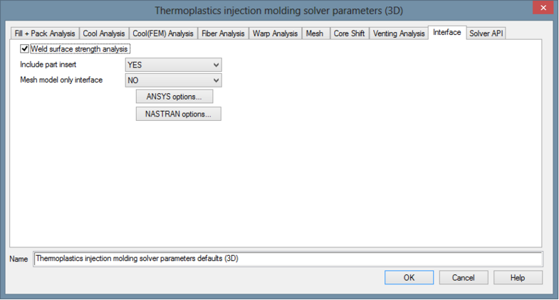 By default, any injection molding simulation in Moldflow predicts the formation and movement of 3D weld surfaces. However, this prediction does not include any information about the temperature or pressure history of the points that lie on the weld surface. The temperature and pressure histories are necessary to map the weld surface to the structural model in Advanced Material Exchange.