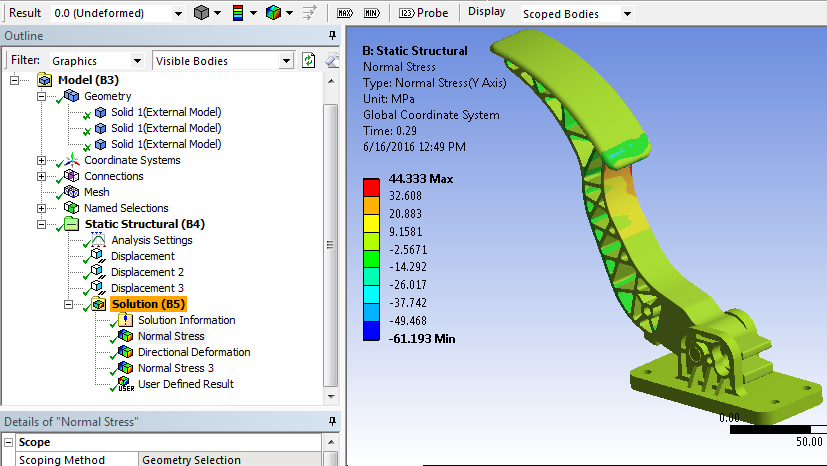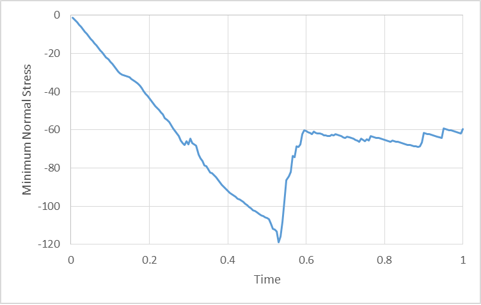 - Evaluate results again and plot the Minimum value of the normal stress. Results will vary depending on the element selected.