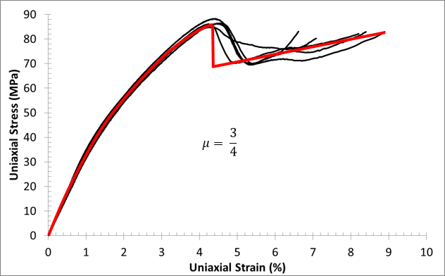 Earlier we saw experimental data showing how the material exhibits a load drop under compression. Let's call the magnitude of this load drop μ. The value of μ varies as the loading angle changes. Therefore, we need a method to determine μ for any stress state that triggers the compressive failure criterion.