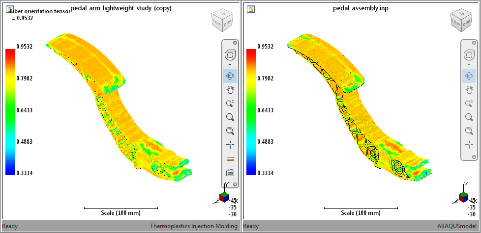 Once the mapping of results is completed, you can view contour plots of the fiber orientation tensor, residual strains, and weld surfaces where applicable. If you are using a fiber-filled material, the display windows will automatically switch from the Mesh view to the Fiber Orientation view. If you are using an unfilled material, the display will automatically switch to the Residual Strain view. A Fill + Pack + Warp Moldflow analysis must be performed to review the Residual Strain results. You must have the .ws3 file present in your working directory to map and view the weld surfaces.