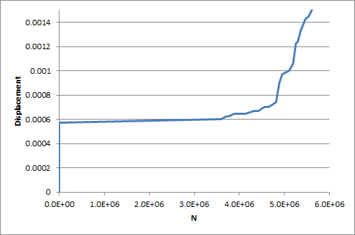 The plot of SDV2 depicts the cycles to failure for each element. You can also use nodal displacements and the cycles to failure for unfailed regions of the model to create a plot of cycles to global structural failure as seen below.