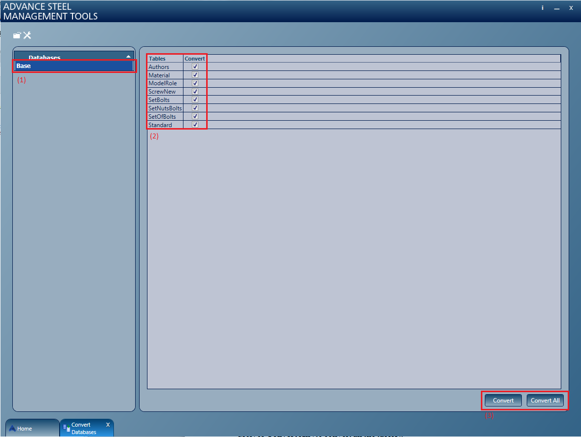 To complete the merge, press Convert (if only some tables are required for merge) or Convert All (to convert all the tables)(3).