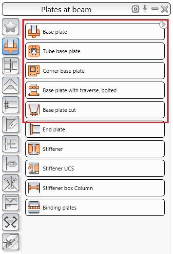 Base plate connections are grouped in the Plates at beam category of the Connection vault.