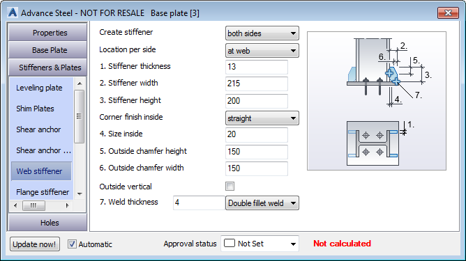 . The base plate is created at the end of the column and the properties dialog appears. Modify the baseplate properties to suit specific requirements. Both the column and the plate are welded together.