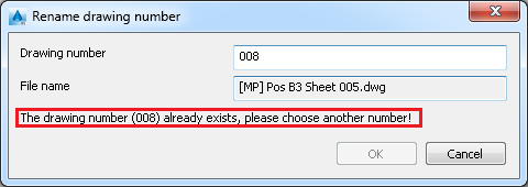 If you modify a file name using the Rename drawing command and then you renumber it using the Rename drawing number command, a warning message will appear stating that the "…new drawing number will not get updated in the file name". The detail drawing will enter the Update labels category.