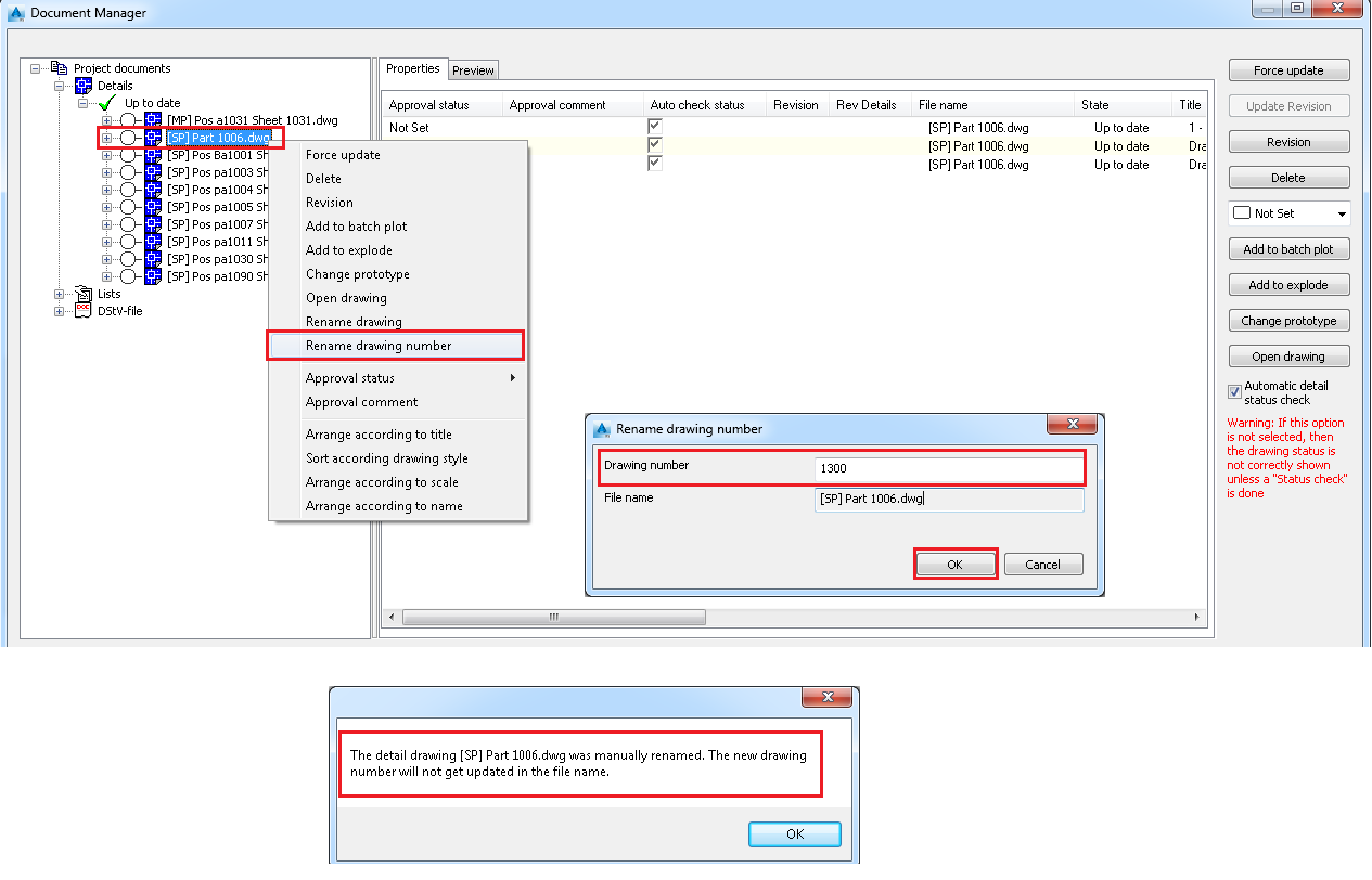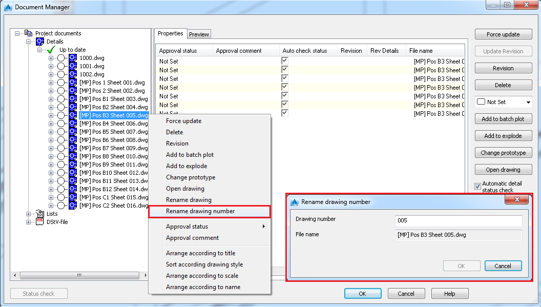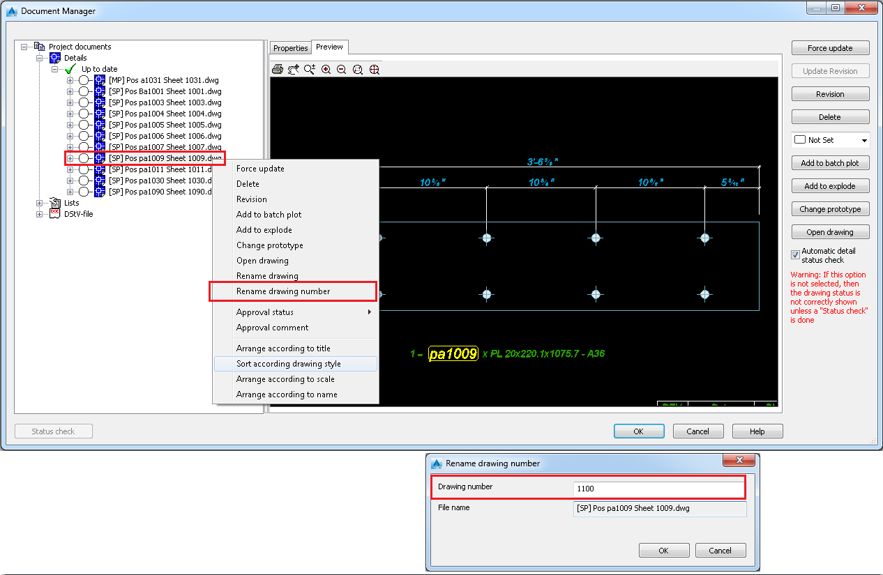 The drawings can be updated directly from the Document Manager. Additionally, you can control the Document Manager behavior related to the detail status check.