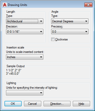 - Set the AutoCAD units: Type _units in the command line and set the units as required in the Drawing Units dialog. It is important to specify the insertion scale to match the unit lengths on the sheet. This ensures that the blocks are correctly scaled: