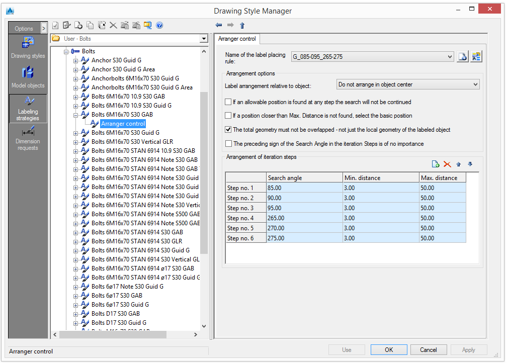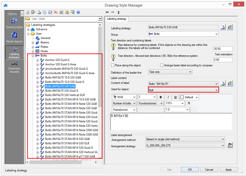 The Used for objects option states for which model objects to apply the definition. This setting influences the selection of the label style on the tree panel after opening a drawing style.