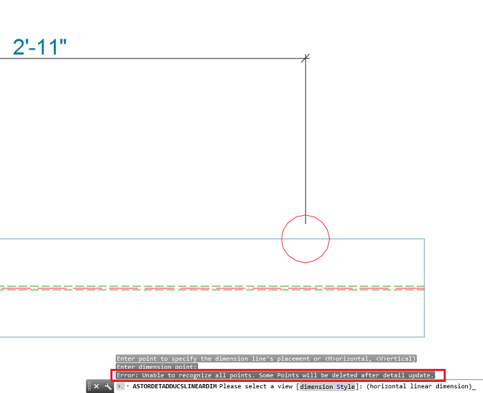 Important: Take note that if you pick an invalid dimension point to define a dimension line, that invalid dimension point will be highlighted with a red circle in the detail drawing, along with a message in the command line warning you that any invalid point will be deleted after update. If you want to create a dimension defined by only two points and at least one of the points is invalid, the entire dimension will be deleted after update. Make sure that all the points you pick to define the dimension line are valid.