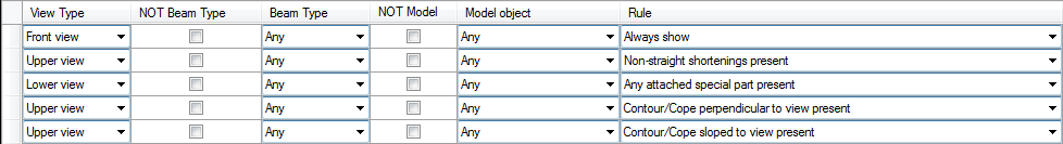 The necessary view configuration is table-based, with a set of entries that map the view with a geometrical condition. A view will appear on the drawing if the condition set here is fulfilled. Below is a fragment of an existing necessary view configuration: